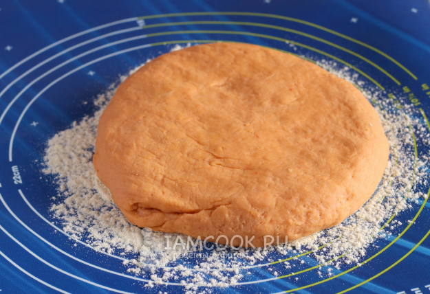 Присыпать мукой рабочую поверхность и выложить тесто.