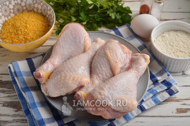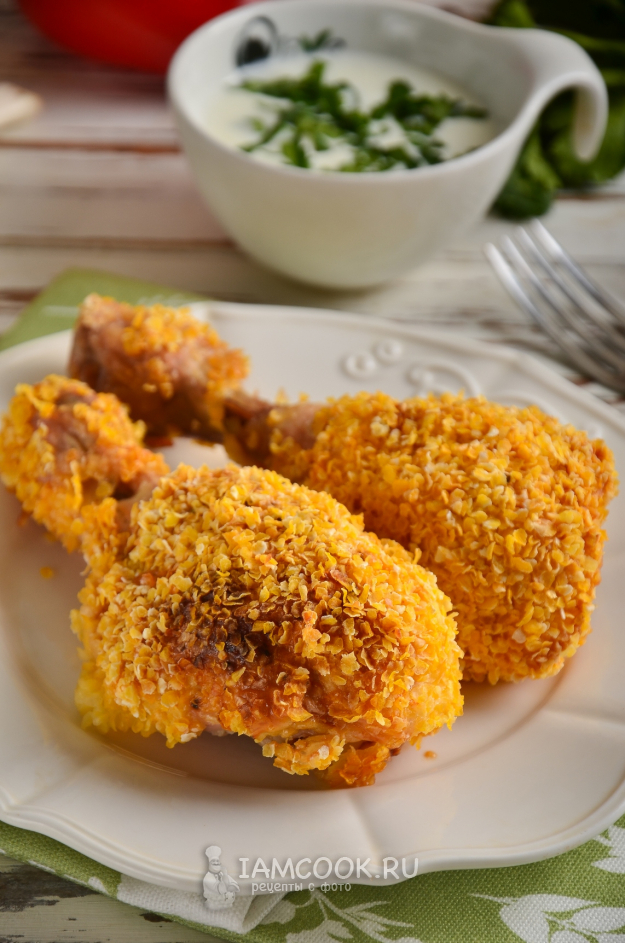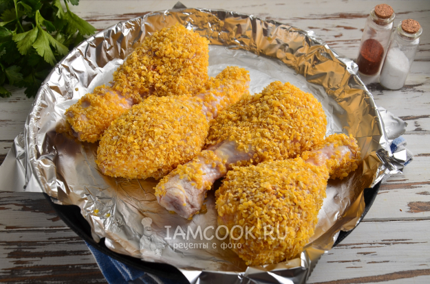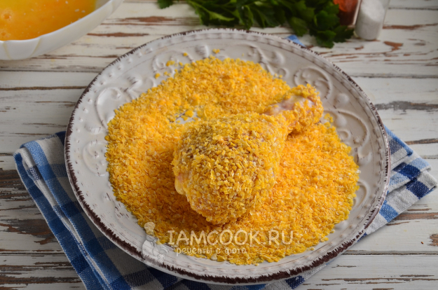 Следующий шаг - куриные голени нужно обвалять в кукурузных хлопьях. Они будут отлично прилипать на слой из яйца.
