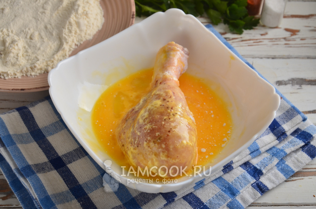 В миску нужно разбить свежее куриное яйцо и хорошенько все взболтать вилкой. Далее нужно каждую голень обмакнуть во взбитое яйцо.