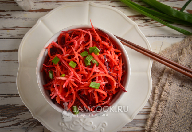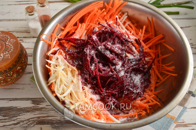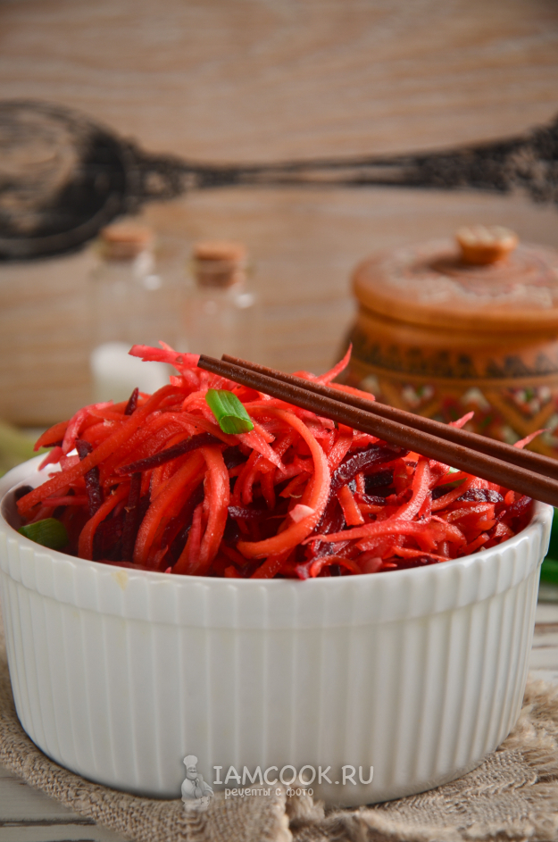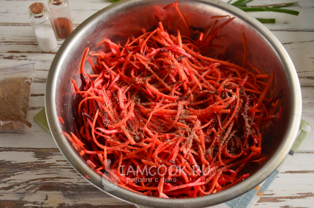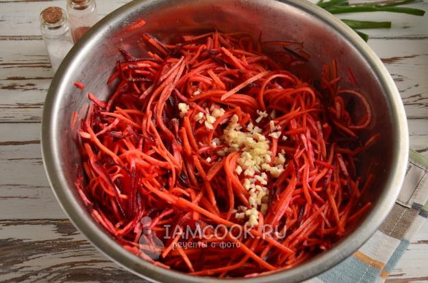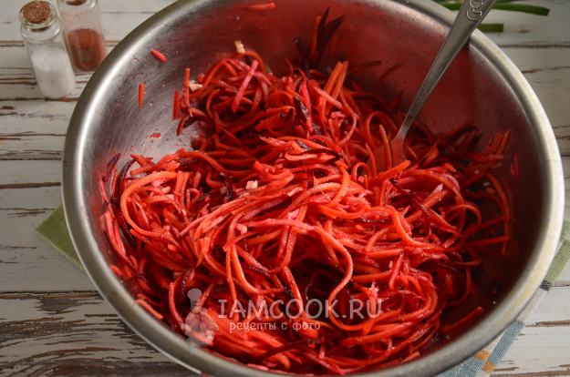 Теперь добавьте растительное масло и столовый 9% уксус. Еще раз все перемешайте, после чего плотно прижмите закуску блюдцем, сверху можно поставить небольшой гнет. Через пару часов морковь по-корейски со свеклой и корнем сельдерея будет готова.