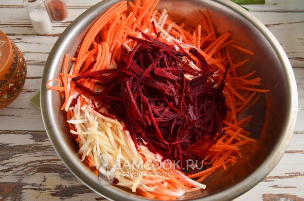 И последний основной ингредиент - это свекла, которую также нужно натереть на терке и положить в миску.