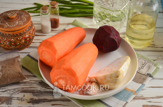 Перед началом приготовления моркови по-корейски со свеклой и сельдереем нужно подготовить все овощи. Морковь, свеклу и корень сельдерея нужно очистить - удобно использовать овощечистку. Конечно, после чистки овощи нужно помыть.