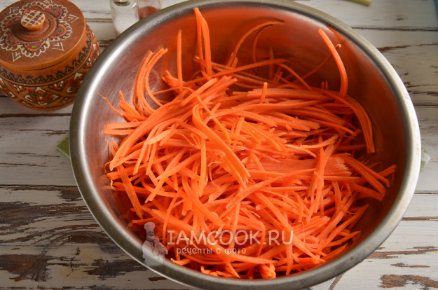 Для приготовления таких закусок используется специальная терка. Очищенную морковь нужно натереть на этой терке, делая по желанию более длинные или более короткие полоски. Сложите морковь в миску.