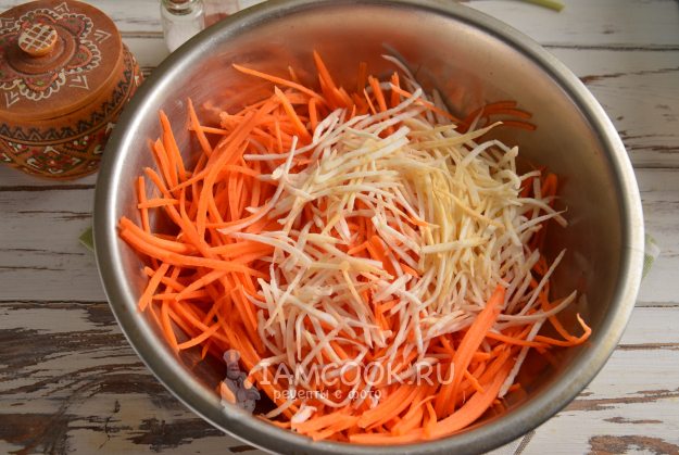 На очереди - корень сельдерея. Натрите его полосками и положите в миску с морковью.