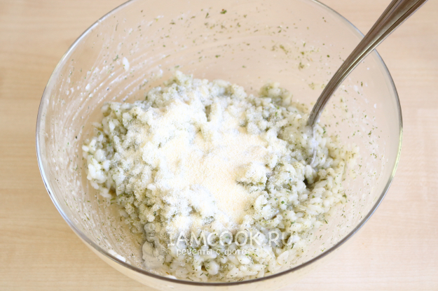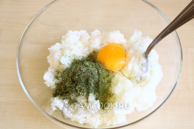 Остуженную рисовую кашу соединяем с яйцом и специями: я беру соль и сушеную зелень - укроп и петрушку.