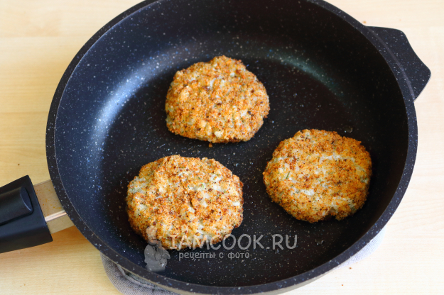 Руки смачиваем водой и формируем котлетки. Лучше делать их небольшого размера - так удобнее жарить изделия. Обваливаем котлеты в панировочных сухарях или той же манке и печём на сухой сковороде с антипригарным покрытием (либо жарим в масле) с двух сторон до золотистости.