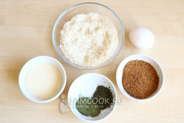 Нам потребуются следующие ингредиенты. Я для приготовления котлет варю рисовую кашу специально, а потому весь процесс занимает больше времени и забот. Вы же можете пойти более рациональным путём и использовать кашу, которая у вас, например, залежалась в холодильнике или осталась после завтрака/ужина. Тогда используйте сразу её, примерно 3 стакана.