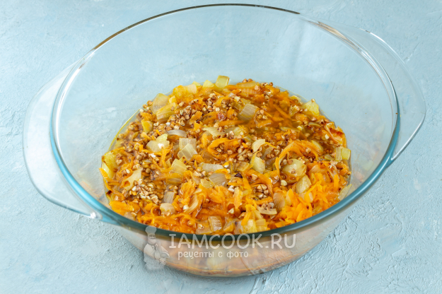 Гречку промываем и убираем мусор. Соединяем гречку с обжаренными овощами в форме, которую будем ставить в духовку. Вливаем воду и солим по вкусу.