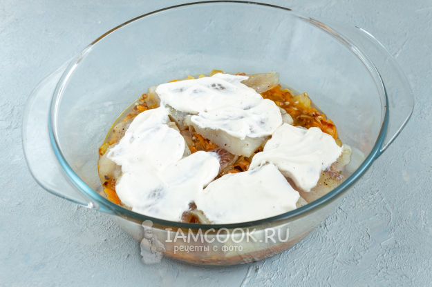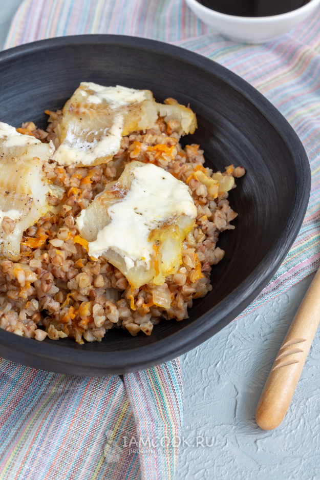 На гречку кладем кусочки минтая и смазываем их сметаной. Накрываем форму крышкой или фольгой и запекаем минтая с гречкой в духовке при температуре 200°С примерно 40 минут. Гречка за это время разбухнет и впитает в себя всю жидкость.