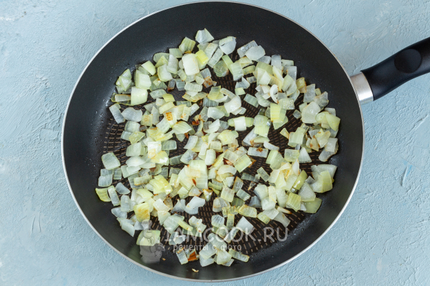 Далее режем мелко лук и обжариваем его на небольшом количестве масла до прозрачности.