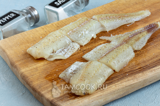 Первым делом необходимо помыть и обсушить бумажными полотенцами филе минтая. Затем порезать на кусочки, посолить, поперчить по вкусу и отложить рыбку в сторонку.