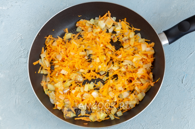 Пока обжаривается лук, натираем на терке морковь. А затем добавляем её к луку и обжариваем еще минутки 2-3.