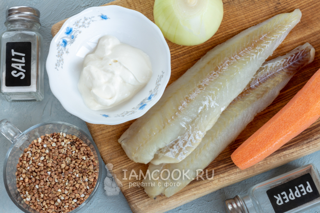 Ингредиенты для приготовления минтая с гречкой в духовке - перед вами.