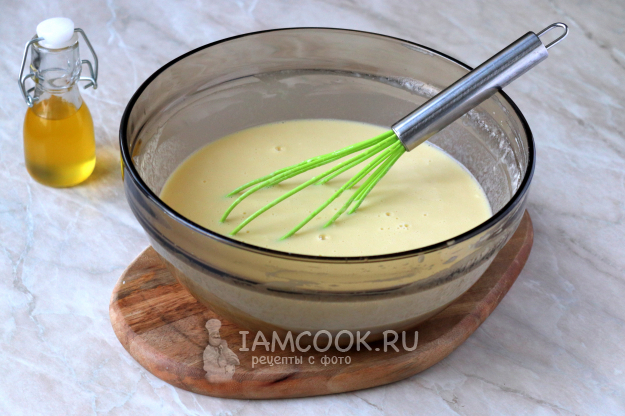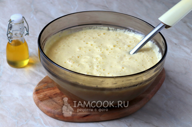 По консистенции тесто должно получиться достаточно жидким и однородным. Накройте миску кухонным полотенцем и оставьте в тёплом месте на 1 час.