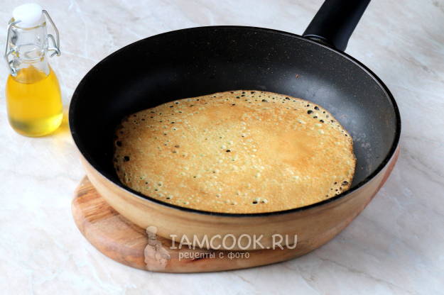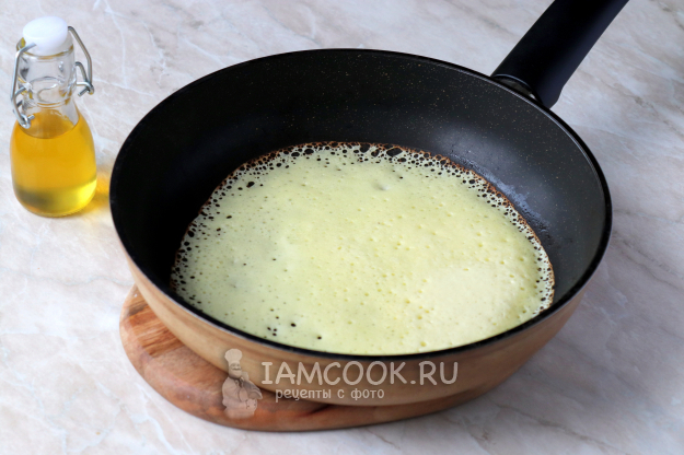 Разогрейте сковороду, смазав её тонким слоем растительного масла, и налейте небольшую порцию теста. Распределите его по всему дну, формируя круглую заготовку.