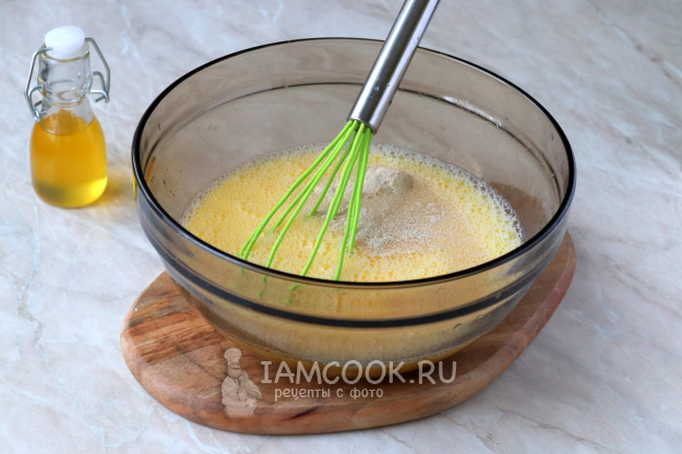 Тёплую сыворотку соедините с куриными яйцами, солью, сахарным песком и растительным маслом. Тщательно перемешайте до однородного состояния и добавьте сухие дрожжи.