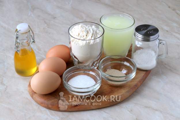 Для приготовления дрожжевых блинов на сыворотке подготовьте продукты по списку к рецепту.