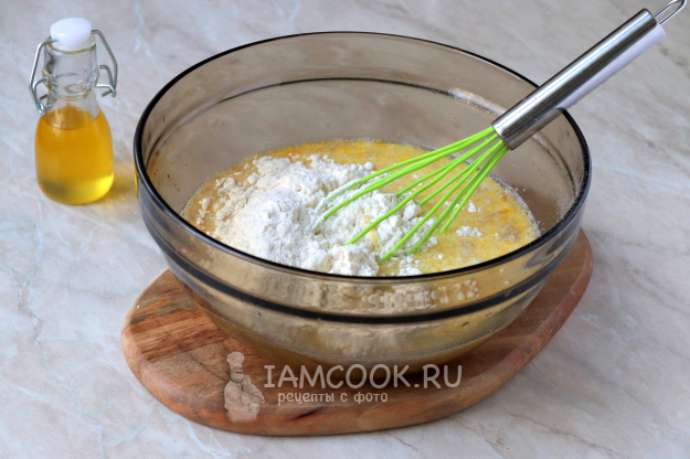 Затем введите просеянную пшеничную муку и снова перемешайте, чтобы все мучные комочки разошлись по жидкости.