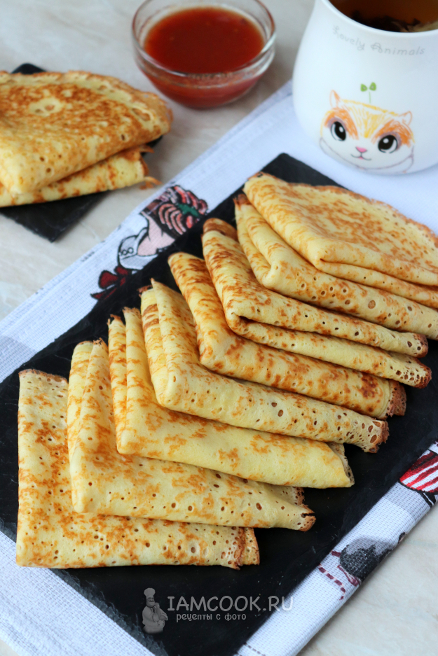 Вот и всё, очень вкусные, ажурные дрожжевые блины на сыворотке готовы. На стол подавайте в тёплом виде с разнообразными добавками. Так как выпечка получается не слишком сладкой, начинка может быть любой.