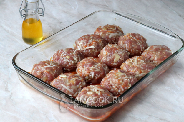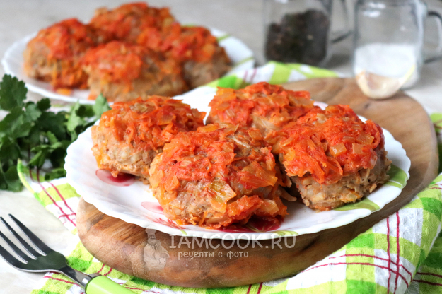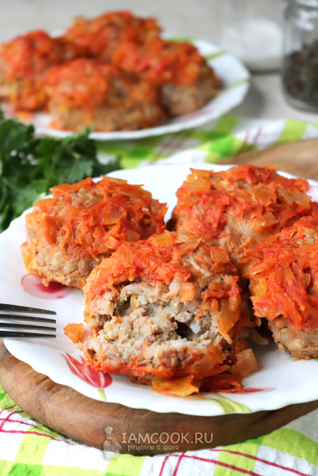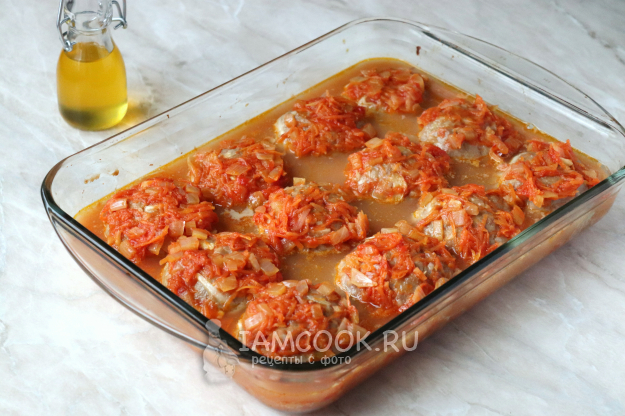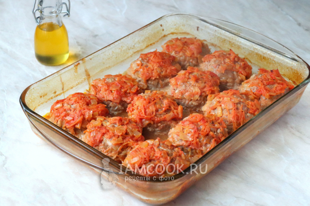 Из получившегося фарша сформируйте круглые или овальные заготовки. На дно жаропрочной формы выложите немного томатного соуса с овощами, а поверх него - голубцы. Отправьте форму на 20 минут в духовку, разогретую до 180 градусов, до образования лёгкой корочки.