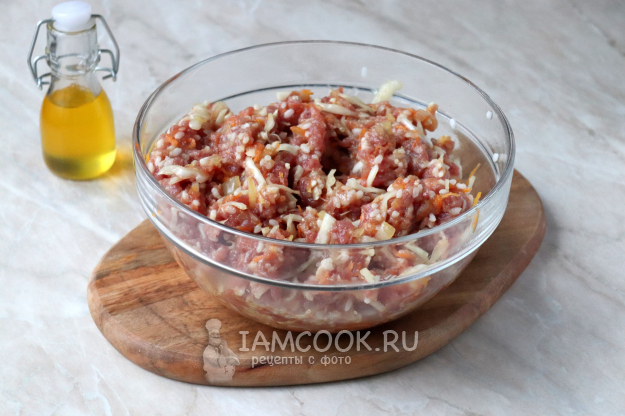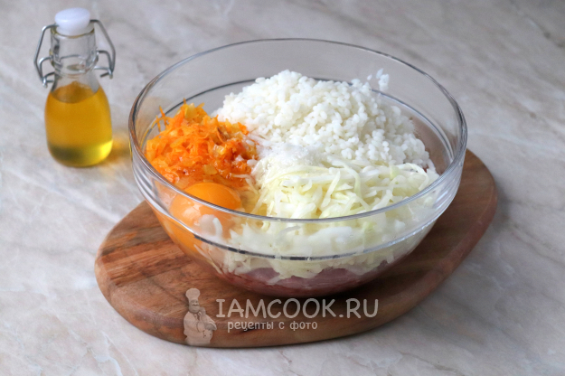 В миску с фаршем добавьте капусту, обжаренный лук с морковкой, рис, куриное яйцо и специи по вкусу.