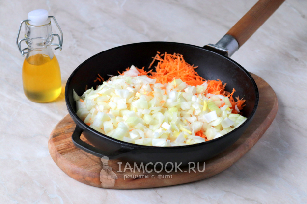 Измельчите очищенные овощи. Лук нарежьте кубиками, морковь натрите на тёрке со средними ячейками. Отправьте овощи на разогретую с растительным маслом сковороду и жарьте, периодически помешивая, около 5-7 минут - до золотистого цвета. После чего часть овощей (примерно половину) переложите на отдельную миску и дайте полностью остыть.