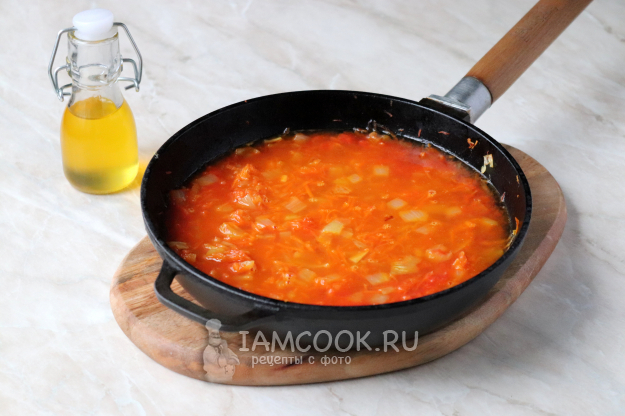 Оставшиеся в сковороде овощи залейте томатным соком, добавьте чистую фильтрованную воду и специи по вкусу. Перемешайте, доведите до кипения и тушите на медленном огне в течение 5 минут.
