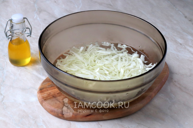 Белокочанную капусту нашинкуйте тонкими, длинными полосками, сложите их в миску и залейте на 15 минут кипятком. После чего воду слейте, откинув капусту на дуршлаг.