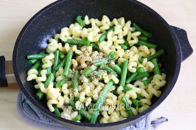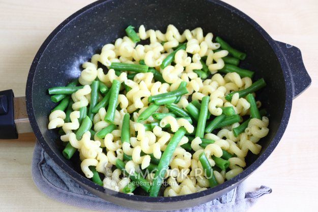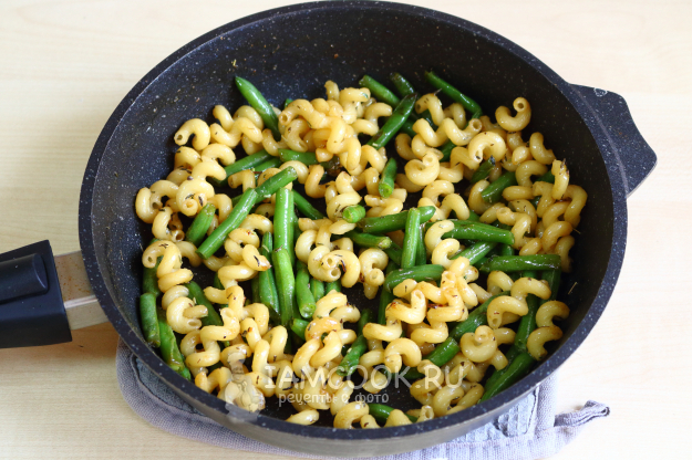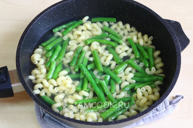 Добавляем к почти готовым макаронам замороженную стручковую фасоль. Доводим до кипения и варим ещё пару минут.