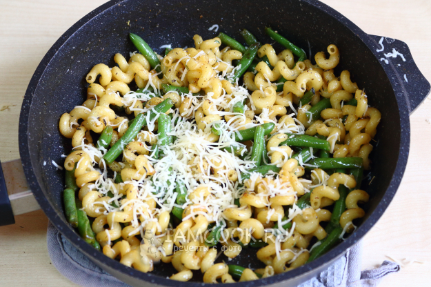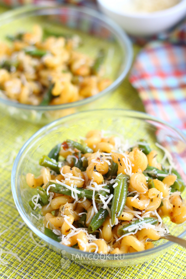 Макароны со стручковой фасолью готовы! Подаём к столу, посыпав дополнительно сыром, в качестве гарнира или самостоятельного блюда. Приятного аппетита!