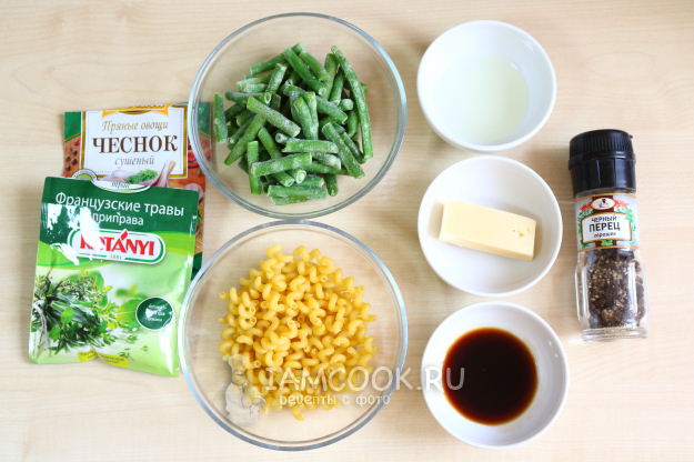 Для приготовления макарон со стручковой фасолью возьмём следующие ингредиенты.