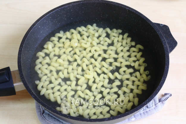 Макароны забрасываем в сковороду с кипящей подсоленной водой и варим до состояния аль денте. Необходимое время варки обычно указано на упаковке. В среднем это занимает 6-8 минут.