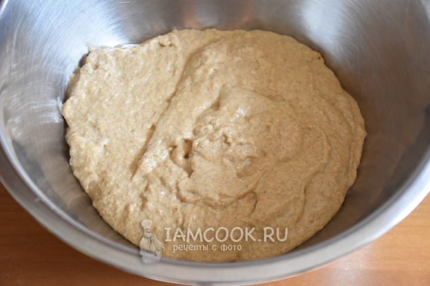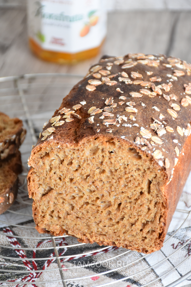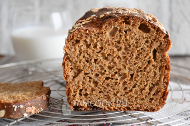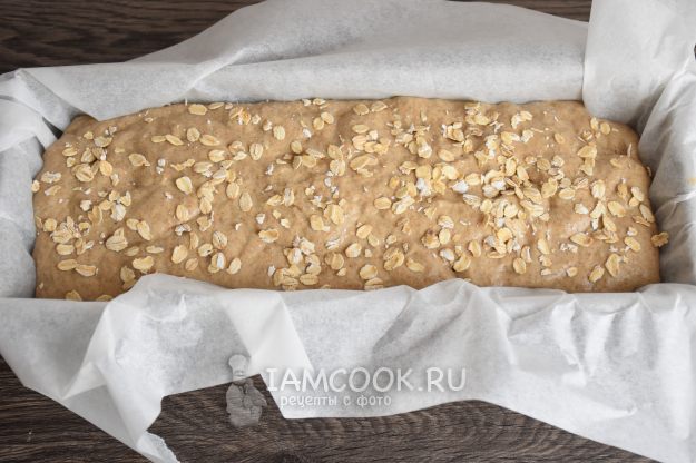 Тесто снова перемешать, выложить в форму с пергаментом и оставить еще на 30 минут в теплом месте. Посыпать сверху овсяными хлопьями и поставить в разогретую до 250°С духовку на 10 минут. Затем температуру духовки снизить до 200°С и выпекать хлеб 55 минут. Если верх хлеба начнет подгорать, накрыть фольгой.