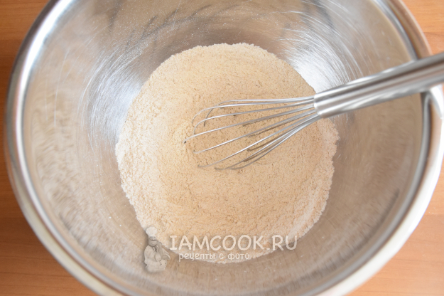 В миску просеять пшеничную и ржаную муку, добавить сахар, соль, дрожжи и хорошо перемешать венчиком.