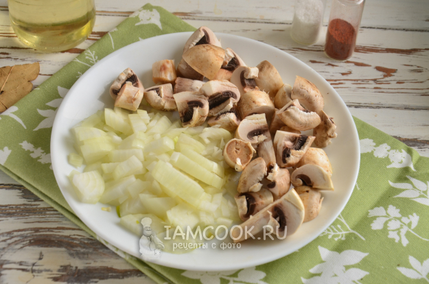 Лук нарежьте мелкими кубиками, шампиньоны разрежьте на 4-5 частей каждый гриб. В мультиварке на режиме Жарка разогревайте в течение минуты растительное масло. Отправьте туда же грибы, лук и обжаривайте их минут 5, помешивая.