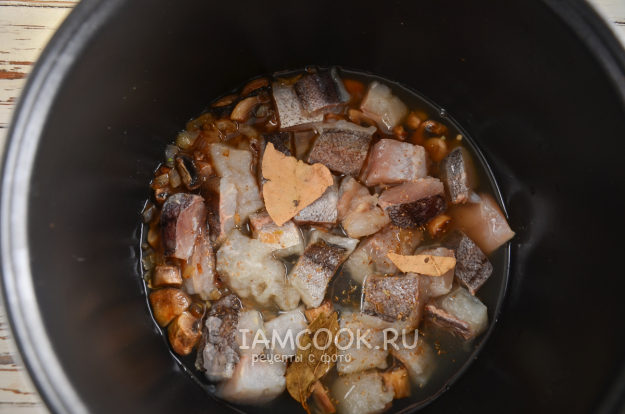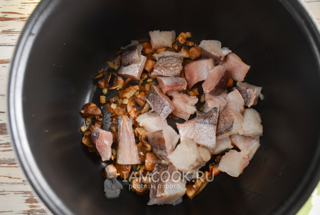 Переложите нарезанную рыбу в чашу мультиварки к грибам.
