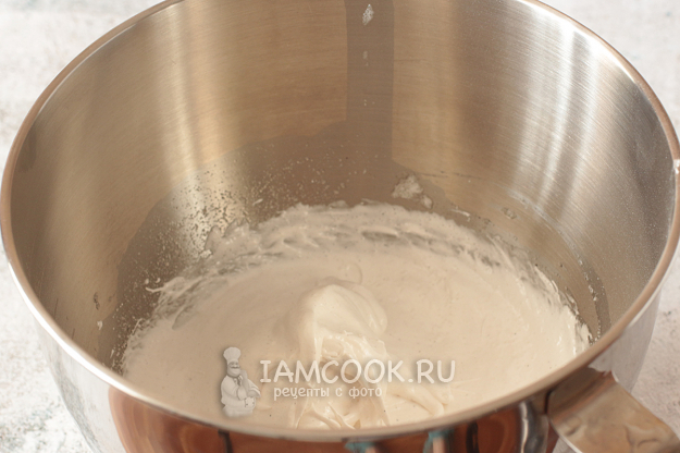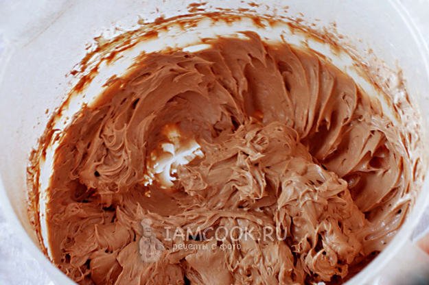 Приготовьте крем. Для этого сначала почти до готовности взбейте сливки, затем добавьте к ним сахарную пудру и какао. Хорошенько смешайте миксером в несколько движений до получения стойкого крема.