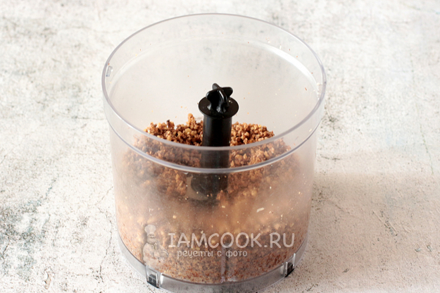 В процессоре измельчите до крошки черный шоколад и жареные грецкие орехи. Старайтесь сделать это быстро, чтобы при нагревании режущего ножа шоколад не начал таять.