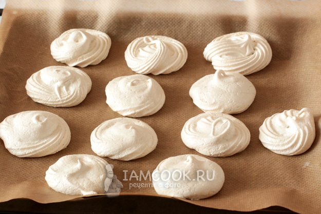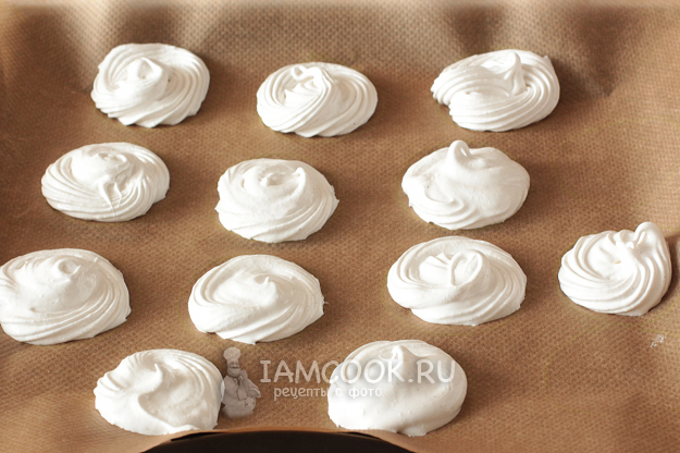 Переложите белки в кондитерский мешок с насадкой или без и отсадите на антипригарный пергамент, стараясь делать заготовки невысокими и одинакового размера. Если не уверены в качестве своего пергамента, то смажьте его сливочным маслом.