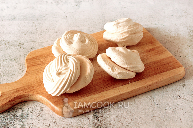 Безе сложите парами подходящего размера. Смажьте половинки кремом и соедините их вместе.