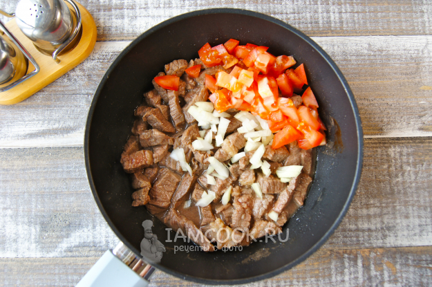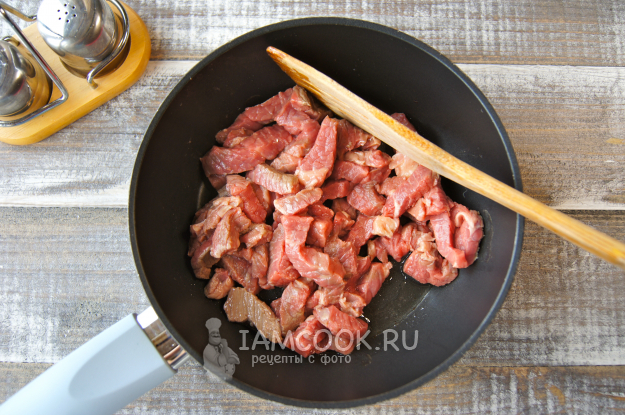 Мясо промойте, обсушите и нарежьте на небольшие кусочки, выложите на разогретую сковороду с маслом, быстро обжарьте и тушите в собственном соку на среднем огне под крышкой около 30 минут.