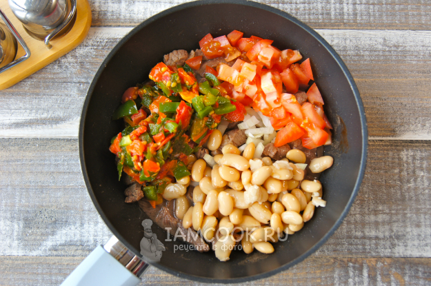 Добавьте нарезанный болгарский перец и консервированную фасоль.