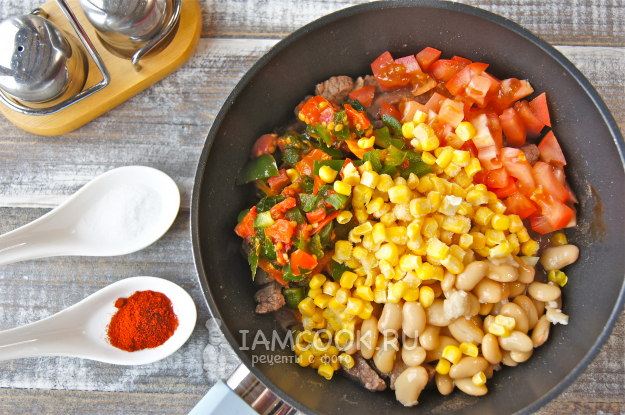 Добавьте замороженную кукурузу, приправьте паприкой, посолите, по желанию поперчите.