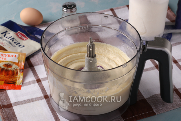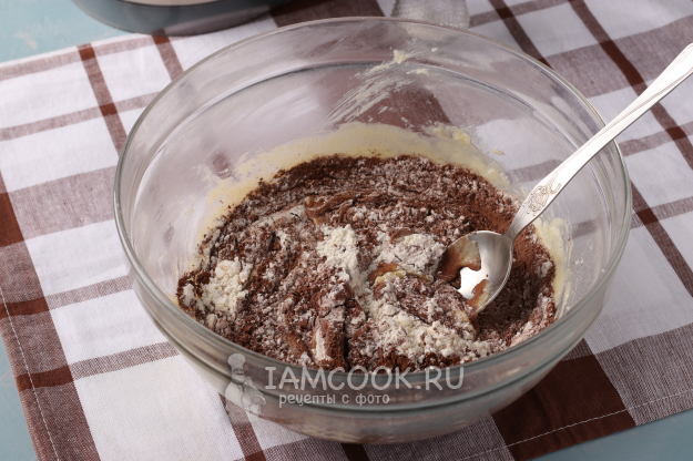 Просеять в тесто муку с какао и разрыхлителем, добавить щепотку соли. Тесто получится довольно густым.