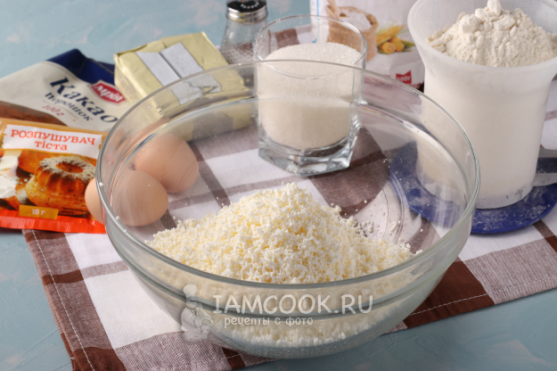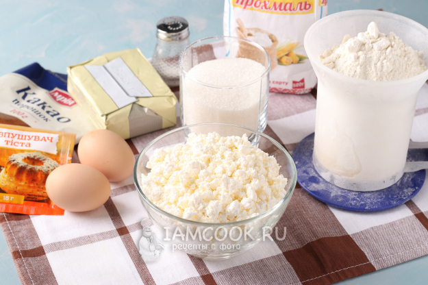 Для приготовления пирога с какао и творожной начинкой подготовить из списка необходимые ингредиенты.