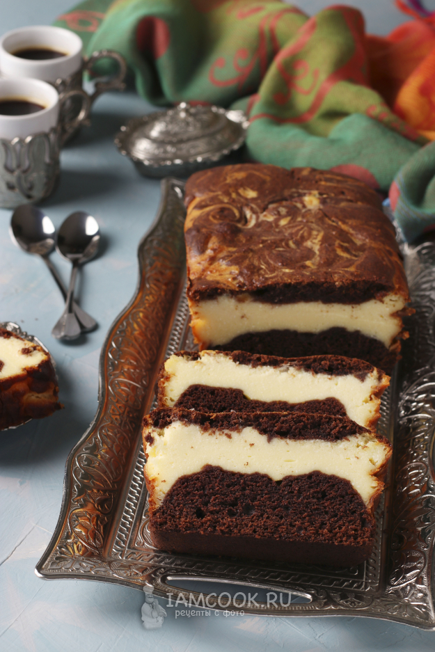 Разогреть духовку до 180 градусов и выпекать пирог с какао и творожной начинкой 35 минут. Готовому пирогу дать полностью остыть.