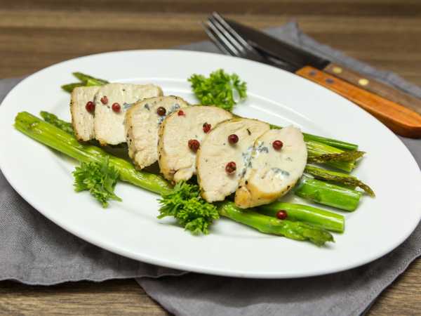 Духовку разогреть до 200 градусов и запекать грудку приблизительно 1 час. Если грудка весом более 1 кг, то времени для запекания может понадобиться больше. Если грудка начнёт слишком румяниться сверху, то её необходимо прикрыть фольгой. Готовую грудку проверить на готовность, проткнув вилкой. Если вытекает прозрачный сок - грудка готова.