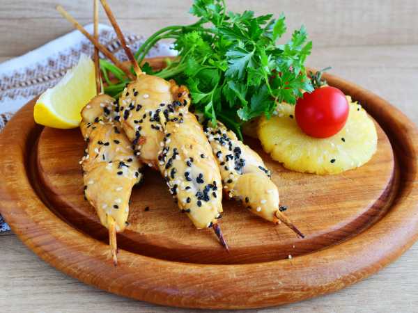 Чеснок нарезать пластинками и распределить под кожу в нескольких местах. Если использовать сухой чеснок, то его можно добавить в маринад. Хорошо смазать грудку маринадом и оставить на 1 час при комнатной температуре. Мариновать можно и дольше, но тогда убрать мясо в холодильник, прикрыв миску крышкой.