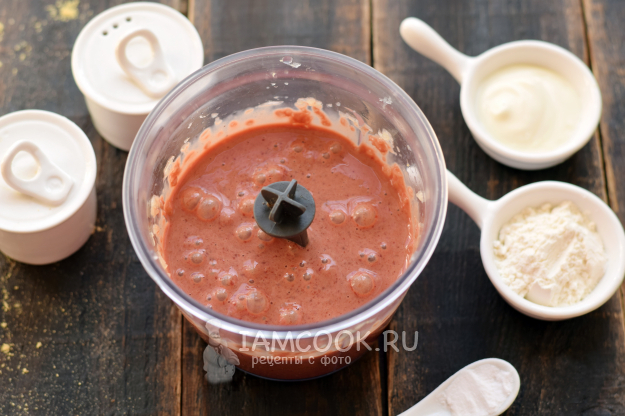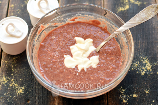 Добавьте сметану, еще раз перемешайте. Сметана делает оладьи мягче, также кислая среда позволяет соде сделать изделия пышными.