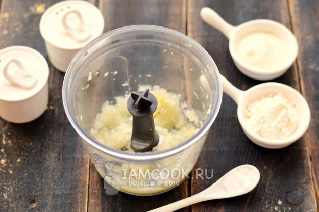 Лук очистите, нарежьте произвольно, поместите в чашу блендера, измельчите в пюре. Лук лучше измельчать отдельно от печени.
